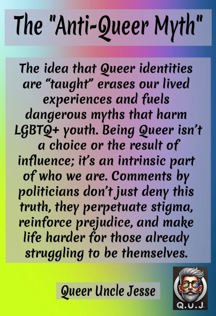 The idea that Queer people are somehow “created” by outside forces is as ridiculous as it is insulting. It’s an argument that denies the reality of Queer existence. To claim that we are not inherently who we are is to erase the experiences of countless people who have known their identities from an early age, long before they ever encountered any “influence.” Growing up, I was surrounded by straight culture. My parents were straight, my teachers were straight, and the movies I watched and books I read were overwhelmingly straight. Heterosexuality and cisgender norms were everywhere, and yet, none of that changed the fact that I was gay.